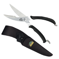 These are the sharpest, most powerful, spring loaded Game Shears available. They make easy work of field dressing birds, small game and fish. Features full-tang 420J2 stainless construction with non-slip rubberized TPR handles, serrated cutting edge and special bone breaking notch. The Game Shears come complete with a quality nylon sheath.